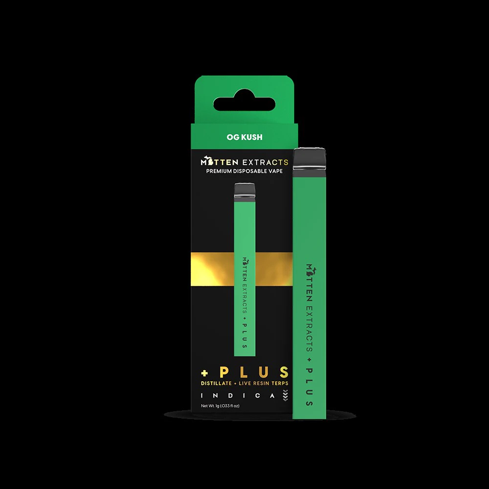 Mitten Extracts- Disposable Vape- OG Kush- Indica- Distillate- Live Resin Terps- Rechargeable- Ceramic Coil-1g- 83%