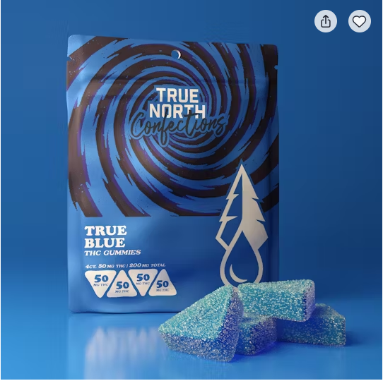 True North Confections True Blue premium THC infused gummies feature an improved vegan formula! These 50 mg pieces are gluten free, dairy free and made with local Michigan farm sourced beet sugar along with natural Berry flavors. 4 x 50 mg THC pieces.200 mg THC total.